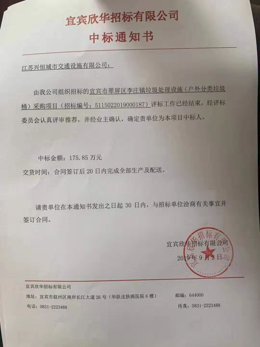 【中标通知】宜宾市翠屏区户外分类垃圾桶采购项目